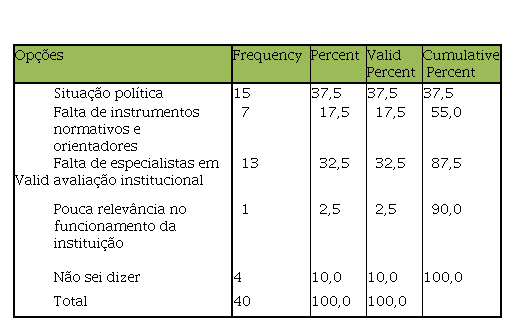 Dos funcionários inquiridos, 37,5% apontaram a situação política como causa que condiciona a realização da avaliação institucional no ISCED, 17,5% a falta de instrumentos normativos e orientadores, 32,5% apontaram a falta de especialistas em avaliação institucional, 2,5% disseram pouca relevância no funcionamento da instituição e 10% não sabem dizer. Dentre as causas mais proeminentes podemos destacar a falta de instrumentos normativos. Neste exacto momento, a tutela ainda não tem aprovado os instrumentos normativos, regulamentos que orientam as instituições realizarem a avaliação institucional. Aliado a isso, nota-se uma certa carência de especialistas em assuntos de avaliação institucional. Isso constitui um mito segundo Silva(2014) o de que qualquer um pode avaliar (ou, na educação, todos somos avaliadores). Isto é errado pois, para avaliar é preciso dispor de competência e legitimidade. Avaliação é complexa e para ser realizada de modo sério, exige formação, competências e suporte técnico e material. Assim, para proceder à avaliação, há que dispor de agentes competentes ou então mais vale ficarmos quietos, sob pena de descredibilizarmos o processo.
