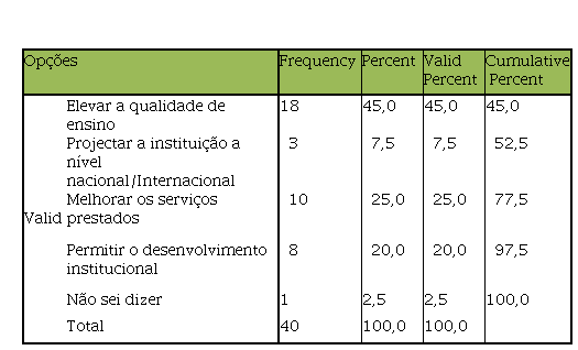 A necessidade da realização da avaliação institucional no ISCED, aponta para os seguintes dados. 45% defendem que é necessário porque eleva a qualidade de ensino 7,5% projecta a instituição a nível nacional/Internacional, 25% melhorar os serviços prestados, 20% permite o desenvolvimento institucional e 2,5% não sabem dizer. A avaliação institucional serve de diagnóstico para fins de planeamento, revisão e orientação, além de permitir que se perceba o grau de distanciamento entre os objectivos propostos e a prática estabelecida no quotidiano institucional. É um instrumento que a instituição pode utilizar em sua trajectória do ser e do fazer-se escola comunitária. É desejável que a avaliação institucional contribua para proporcionar oportunidades de autoconhecimento, melhoria dos processos, e prestação de contas. Assim sendo, ela funciona como um meio de regulação da actividade das Instituições de ensino Superior visando alcançar os níveis esperados de qualidade (Silva, 2014).