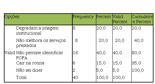 Sobre os efeitos da ausência da avaliação institucional no ISCED, 20% defenderam que degradam a imagem institucional, 20% disseram que não melhora os serviços prestados, 40% disseram que não permite identificar FOFA, 15% disseram que se pode cair na rotina e 5% não sabem dizer. Tendo em vista que esses processos são públicos e por ser uma instituição social, criada e mantida pela sociedade, a escola precisa avaliar-se e tem o dever de se deixar avaliar para conhecer e aprimorar a qualidade e os compromissos de sua inserção. Segundo Silva(2014), os efeitos da ausência da avaliação institucional contribui a situação de anomalias, incumprimentos, ilegalidades, desordem, desleixo, perversão do sentido da missão essencial da universidade, falta de qualidade no ensino e na investigação.