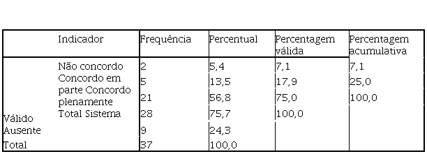 O indicador número dois, da mesma pergunta, referente aos aspectos quantitativos da avaliação, 80,8% dos professores não concorda que avaliação se refira apenas aos aspectos quantitativos da aprendizagem, enquanto 15,4% dos professores concorda em parte. Outra percentagem, mínima, de 3,8% é a que concorda plenamente. (Ver tabelas em anexo 9)