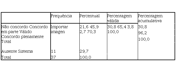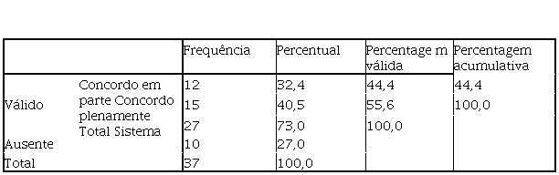 A pergunta número cinco, sobre se a utilização de um único instrumento de avaliação contribui para o desenvolvimento de capacidades, habilidades, atitudes, carácter e valores para o estudante, 77,8% dos professores não concorda com esta perspectiva, acreditando mesmo que a diversificação é a melhor solução para se efectivar os pressupostos correctos para a aprendizagem. Apenas 3,7% dos professores concorda plenamente e 18,5% concorda com reserva. A tabela 5 demonstra o que foi exposto.