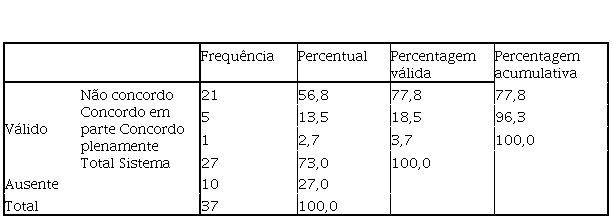 Em relação à pergunta número um (com três indicadores), sobre o conceito de avaliação das aprendizagens, 66,7% dos professores da amostra não concorda que avaliação se refira apenas aos aspectos qualitativos da aprendizagem, enquanto 25,9% concorda em parte, sendo que o menor número de professores concorda plenamente, constituindo 7,4%.