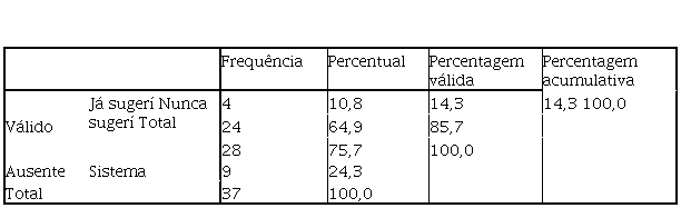 Desses 14,3% que chegaram a sugerir, não tiveram as suas sugestões aplicadas no sistema de avaliação da Instituição, o que se subentende que tiveram suas propostas rejeitadas, ou foram consideradas impertinentes.