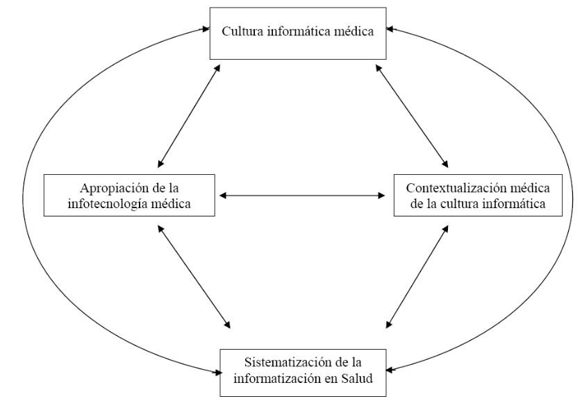 La cultura informática médica y la sistematización de la informatización en salud constituyen un par dialéctico que median entre la apropiación de la cultura infotecnológica médica y la contextualización médica de la información tecnológica.