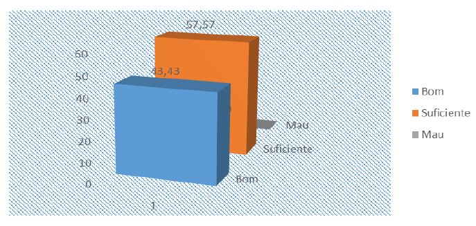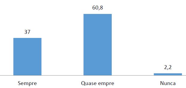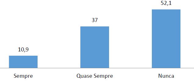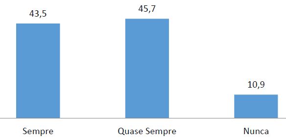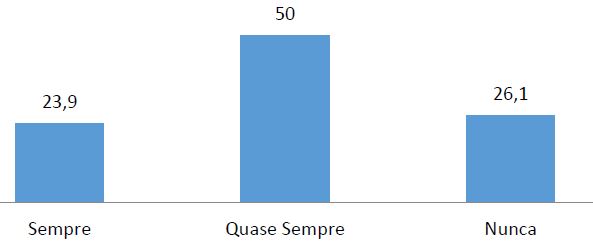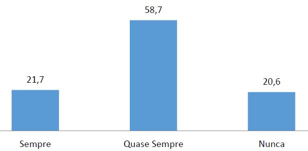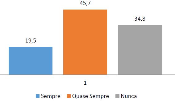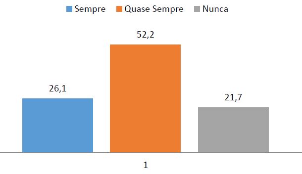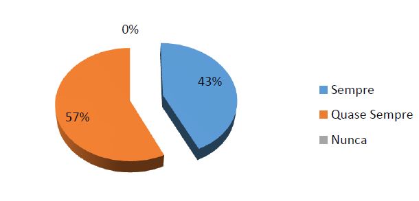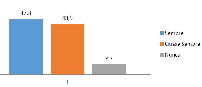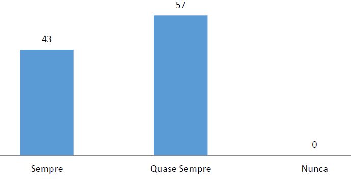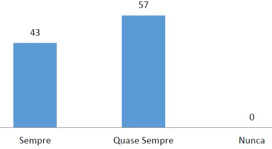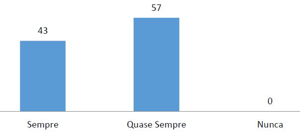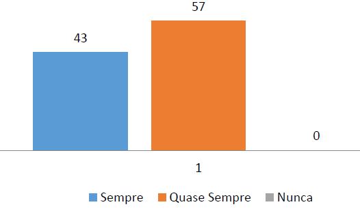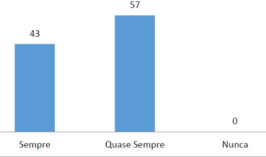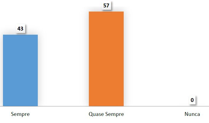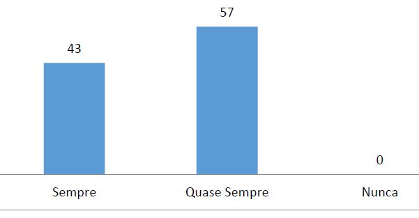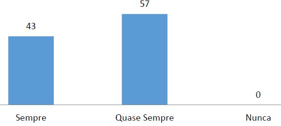 Os valores constantes do gráfico indicam que existe abertura para os funcionários expressarem suas ideias e quase sempre são tidas em conta. Ao considerar as contribuições de cada funcionário a instituição dá abertura para que estes se sintam como parte integrante da mesma, contribuindo com as suas ideias, desejando que elas sejam tidas em conta pela liderança. Esta abertura contribui, ainda, para que o colaborador mais facilmente aceite as normas e procedimentos, ao invés daquelas que lhe são impostas sem a sua participação, uma vez que ao ver sua ideia ou contribuição respaldada numa decisão, este sentir-se-á como parte do grupo que tomou a decisão (Almeida, 2000).