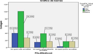 O gráfico informa-nos que os indivíduos com cultura geral média são os que mais acreditam nos médicos com 36,6, os inquiridos que acreditam razoavelmente nos médicos são representados por 14,13% e finalmente 6,16% dos inquiridos acreditam pouco nos médicos. Por outro lado, os inquiridos de cultura geral baixa são os que acreditam menos na informação que vem dos médicos, 9,8%, 6,16% e 6,16% respectivamente acredita pouco nos médicos.
