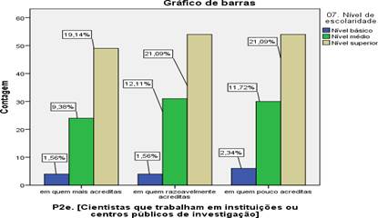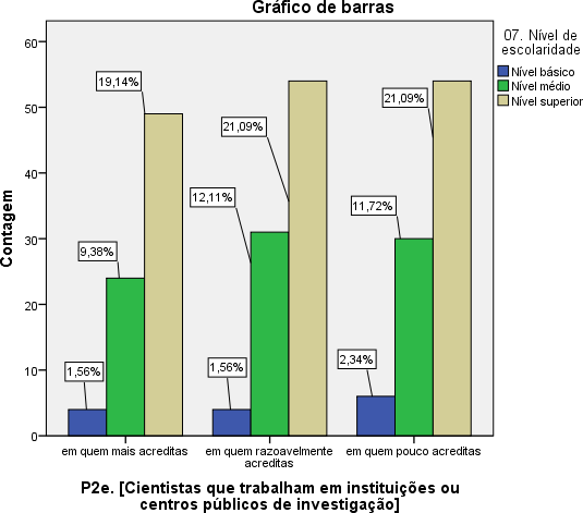 Quando cruzamos as variáveis, os inquiridos com baixo nível de escolaridade, apenas 1,1% acredita mais em cientistas que trabalham na indústria; 1,5% acredita razoavelmente e 3,4% acredita pouco nesta categoria. Ao contrário dos inquiridos que possuem o nível de escolaridade médio onde 6% acredita mais nesta classe, 13,3% acredita razoavelmente e igualmente 13,9 acredita pouco nesta classe. Finalmente os inquiridos com nível de escolaridade superior, 15% acredita mais nesta classe, 20% acredita razoavelmente e 24,9% acredita pouco nesta classe.