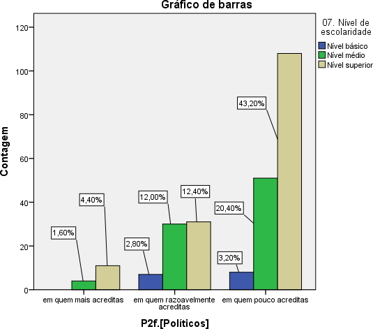 Já no que respeita a categoria dos Políticos apenas 6% acredita neles, 27,2% razoavelmente e mais da metade 66,8% acredita pouco nesta categoria. A questão 2 considerou o cruzamento da categoria políticos e nível de escolaridade. Neste cruzamento, os inquiridos de nível superior apresentam uma opinião bipolar, ou seja, são os que mais acreditam nos políticos com 4,4% e simultaneamente os que pouco acreditam com uma percentagem de 43,2%. Os inquiridos com classe básica são aqueles que menos acreditam nos políticos e em todas as opções aparecem com percentagem baixa, ou seja, 2,8 inquiridos com classe baixa acredita razoavelmente nos políticos e 3,2% acredita pouco nos políticos. Os inquiridos com classe média ficaram posicionados na linha intermédia com as seguintes as percentagens de 1,6%, 12% e 3,2% respectivamente.