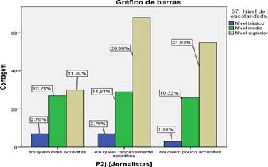 No que diz respeito à variável Jornalistas versus nível de escolaridade, os inquiridos com escolaridade superior são os que mais acreditam nos jornalistas com percentual de 11,9%; os de escolaridade média apresentam uma percentagem de 10,7% e os de escolaridade baixa apresentam 2,7% de crença a classe de jornalistas. Por outro lado, os de escolaridade superior são os que menos acreditam nos jornalistas com 21,8%, seguidos pelos inquiridos com escolaridade média e baixa com 10,3% e 1,1% respectivamente.