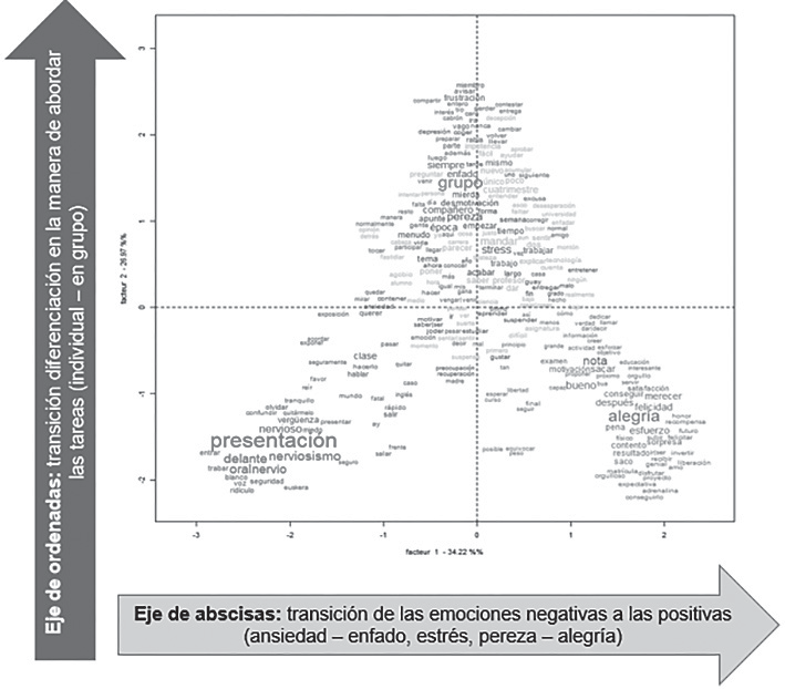 Si se pone atención en el eje de abscisas, se observará que el primer factor, compuesto por el 34,22% de la masa total del corpus, dividió las clases obtenidas en función de las emociones. Así, separó la clase 5 “Ansiedad ante presentaciones orales” (situada en las abscisas negativas) de la clase 2 “Alegría tras esforzarse” (abscisas positivas) y ambas se distinguen de las clases 1, 3 y 4 tendentes a la centralización, situándose en torno al eje de abscisas. Se puede observar la transición de emociones negativas al realizar presentaciones orales relacionadas con la ansiedad (“nerviosismo”, “nervios”, “nervioso/a”) hasta las positivas, en la que predomina la “alegría” y se relaciona con la “nota” y el “esfuerzo”. En este transcurso de la ansiedad a la alegría, se hallan emociones negativas como el “enfado” el “estrés” o la “pereza”.