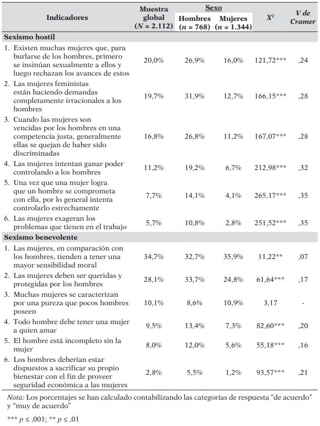Por su parte, los indicadores que mostraron mayor grado de acuerdo en la subescala de sexismo benevolente fueron, para ambos sexos: “las mujeres, en comparación con los hombres, tienden a tener una mayor sensibilidad moral” (34,7%) y “las mujeres deben ser queridas y protegidas por los hombres” (28,1%). Asimismo, de los resultados se desprenden dos hallazgos; en primer lugar, los indicadores uno y tres fueron los únicos en las dos subescalas donde las mujeres puntuaron más alto que los hombres, si bien en el tercer indicador las diferencias no alcanzaron la significación estadística (ver Tabla 1). Por otro lado, la diferencia más grande se produjo en el ítem que presenta al hombre como proveedor económico (“los hombres deberían estar dispuestos a sacrificar su propio bienestar con el fin de proveer seguridad económica a las mujeres”). La proporción de hombres que apoyaron este ítem fue entre cuatro y cinco veces mayor que la proporción de mujeres (5,5% de acuerdo en el caso de los hombres versus 1,2% en el caso de las mujeres, V de Cramer = ,21).