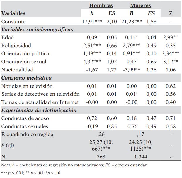Para examinar si los factores que predicen el sexismo ambivalente difieren entre sexos, se estimaron modelos de regresión separados para hombres y mujeres. Los resultados de estos modelos y sus correspondientes pruebas z, que indican si las diferencias en los coeficientes de hombres y mujeres son significativas (Paternoster, Brame, Mazerolle, & Piquero, 1998), se presentan en la Tabla 2. Los hallazgos sugieren que los factores predictivos de las actitudes sexistas varían ligeramente en función del sexo de los participantes. Entre los hombres, los encuestados que se identificaron como religiosos (b = 2,51; p ≤ ,001), heterosexuales (b = 4,32; p ≤ ,001) y más conservadores (b = 1,49; p ≤ ,001) fueron significativamente más sexistas que sus homólogos. En este modelo, la edad fue marginalmente significativa (b = -0,09; p ≤ ,10) y la mayor juventud predijo actitudes más sexistas entre los hombres. Por su parte, las mujeres de mayor edad (b = 0,11; p ≤ ,05), que se identificaron como religiosas (b = 2,79; p ≤ ,001) y políticamente conservadoras (b = 0,91; p ≤ ,001) obtuvieron puntuaciones más elevadas en la escala de sexismo ambivalente en comparación con las mujeres de menor edad, que se identificaron como no creyentes y se ubicaron más a la izquierda ideológicamente. También las mujeres que indicaron tener nacionalidad española fueron significativamente menos sexistas que las estudiantes de otras nacionalidades (b = -3,99; p ≤ ,001). El consumo de serie de detectives resultó marginalmente significativo en este modelo (b = 0,01; p ≤ ,10), de forma que la mayor exposición a este tipo de contenidos predijo actitudes más sexistas entre las mujeres.