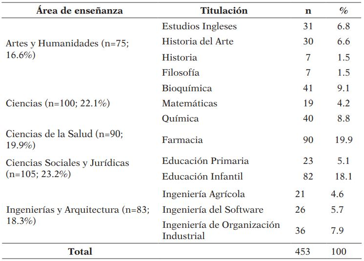 La muestra utilizada comprendió 453 estudiantes de primer curso de la Universidad de Sevilla (España) que promediaron 19.76 años de edad (DT = 4.78). Del total, un 58.1% fueron mujeres y un 41.9% hombres. Los participantes se seleccionaron mediante un muestreo no probabilístico incidental, basado en la accesibilidad a los estudiantes y profesorado implicados. Para asegurar la heterogeneidad de la muestra, se invitó a estudiantes de las cinco áreas de conocimiento de enseñanza universitaria: Artes y Humanidades, Ciencias Sociales, Ciencias Naturales, Ciencias de la Salud e Ingeniería y Arquitectura (ver Tabla 1).