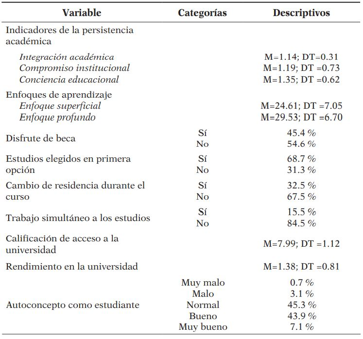 Rendimiento en la universidad. En el momento de la recogida de información, los participantes habían finalizado su primer cuatrimestre de estudios universitarios. Se solicitó a los estudiantes que indicasen el número de aprobados, notables, sobresalientes y matrículas de honor obtenidos durante dicho periodo. A cada una de estas notas se asignaron, respectivamente, los valores 1, 2, 3 y 4. El rendimiento del estudiante se obtuvo como promedio de dichas calificaciones. Por tanto, esta variable se midió en una escala de 1 a 4.