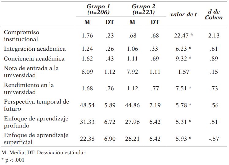 La clasificación de los participantes, mediante el análisis jerárquico de conglomerados, ha permitido llevar a cabo una partición de la muestra en dos grupos de estudiantes con alta y baja probabilidad de persistencia. La tabla 3 recoge los estadísticos descriptivos para las variables predictoras de la persistencia alcanzados en cada uno de los grupos. El grupo 1 presenta altos niveles en cada uno de los indicadores de persistencia, comprendidos entre el valor 1.24 para la integración académica y el valor 1.76 alcanzado en compromiso institucional. Este grupo se identifica con estudiantes a los que corresponden altas probabilidades de persistencia. En cambio, los incluidos en el grupo 2 muestran valores más bajos en las tres variables predictoras. Aunque los valores en estas no llegan a ser negativos, son significativamente más bajos que en el grupo 1, situándose en torno a la puntuación 1, o incluso claramente por debajo de ella (0.68 en compromiso institucional). Es decir, este grupo se caracteriza por unas posibilidades de persistencia relativamente bajas.