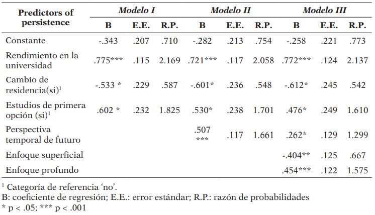 La comparación del logaritmo neperiano de la verosimilitud correspondiente a los tres modelos (-2LL = 514.14 para el Modelo I, -2LL = 494.18 para el Modelo II y -2LL = 466.61 para el Modelo III) muestra que la inclusión de la perspectiva temporal de futuro y los enfoques de aprendizaje incrementaron significativamente la capacidad del modelo para predecir una probabilidad elevada de persistencia (∆-2LL = 19.96, p < .001 and ∆-2LL = 27.57, p < .001).