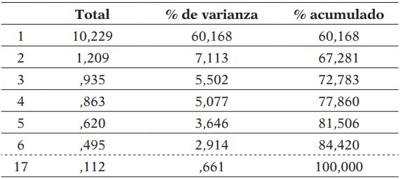 El índice KMO = 0,971 alcanzó un valor excelente, lo que permitía continuar el proceso con garantías. Los resultados iniciales obtenidos en el AFE se muestran en la tabla 2.
