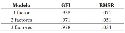 Uso de varios criterios objetivos para la retención de factores, que combinados con criteros teóricos y de interpretabilidad conduzcan a la solución factorial más parsimoniosa y plausible. En nuestro estudio particularmente se lleva a cabo la valoración del ajuste de soluciones alternativas mediante los índices GFI y RMSR. Se consideran indicativos de un ajuste satisfactorio valores de GFI iguales o superiores .95. Para RSMR valores iguales o inferiores a .05 son considerados satisfactorios y por debajo de .08 aceptables (Hu & Bentler, 1999).