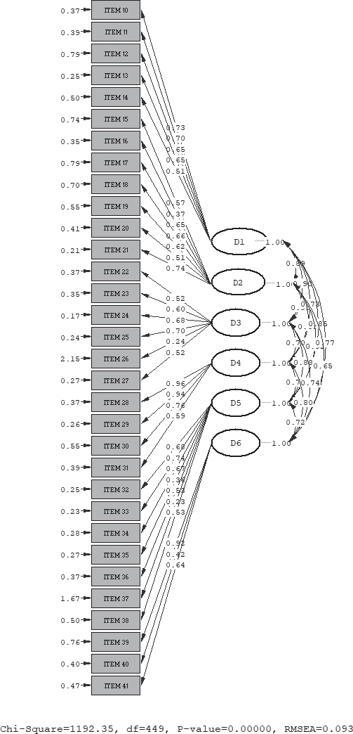 Se realizó un análisis factorial confirmatorio (AFC) para valorar la estructura de dimensiones teóricas propuesta para la escala. Se excluyó de los análisis la dimensión relacionada con los datos de identificación de los participantes y del contexto, sometiéndose a los análisis las 6 dimensiones relacionadas con el aprendizaje y el desarrollo personal. Para ello se empleó el programa Lisrel v.8.80. Se utilizó el método de máxima verosimilitud para estimar los parámetros. Para analizar la bondad de ajuste del modelo, se utilizaron los índices absolutos de chi cuadrado (χ2), el RMSEA (Root Mean Square Error of Aproximation o error de aproximación cuadrático), considerando valores aceptables <.08 (Cole y Maxwell, 1985), el SRMR (Standadized Root Mean square, Residual o media de residuos estandarizados), indicando valores de .06 o menos, que muestran un excelente ajuste (Hu & Bentler, 1999). En cuanto a los índices relativos, se empleó el GFI (Goodness of fit o índice de bondad de ajuste), el CFI (Comparative fit o ajuste comparado) que indica reducciones de ajuste pobre y el NFI que compara la falta de ajuste del modelo hipotetizado con la falta de ajuste del modelo nulo. Tanto el GFI, como el CFI y el NFI deben obtener valores superiores a .09 para considerarse aceptables (Nuñez-Alonso, Martín-Albo, y Navarro-Izquierdo, 2005).