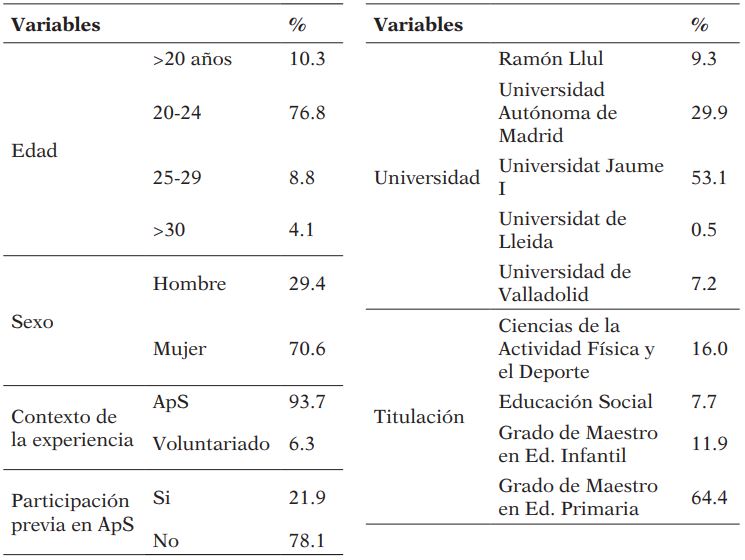 La muestra estuvo compuesta por 200 estudiantes que habían participado en alguna experiencia de ApSU-AF durante el curso 2016/17 y/o 2017/18. Se trata de un muestreo de conveniencia y se ajusta a los parámetros establecidos por Nunnally (1978) para el estudio de un instrumento, donde se requiere que al menos haya cinco sujetos por ítem y un número máximo de diez. Las características de la muestra se recogen en la Tabla 1.