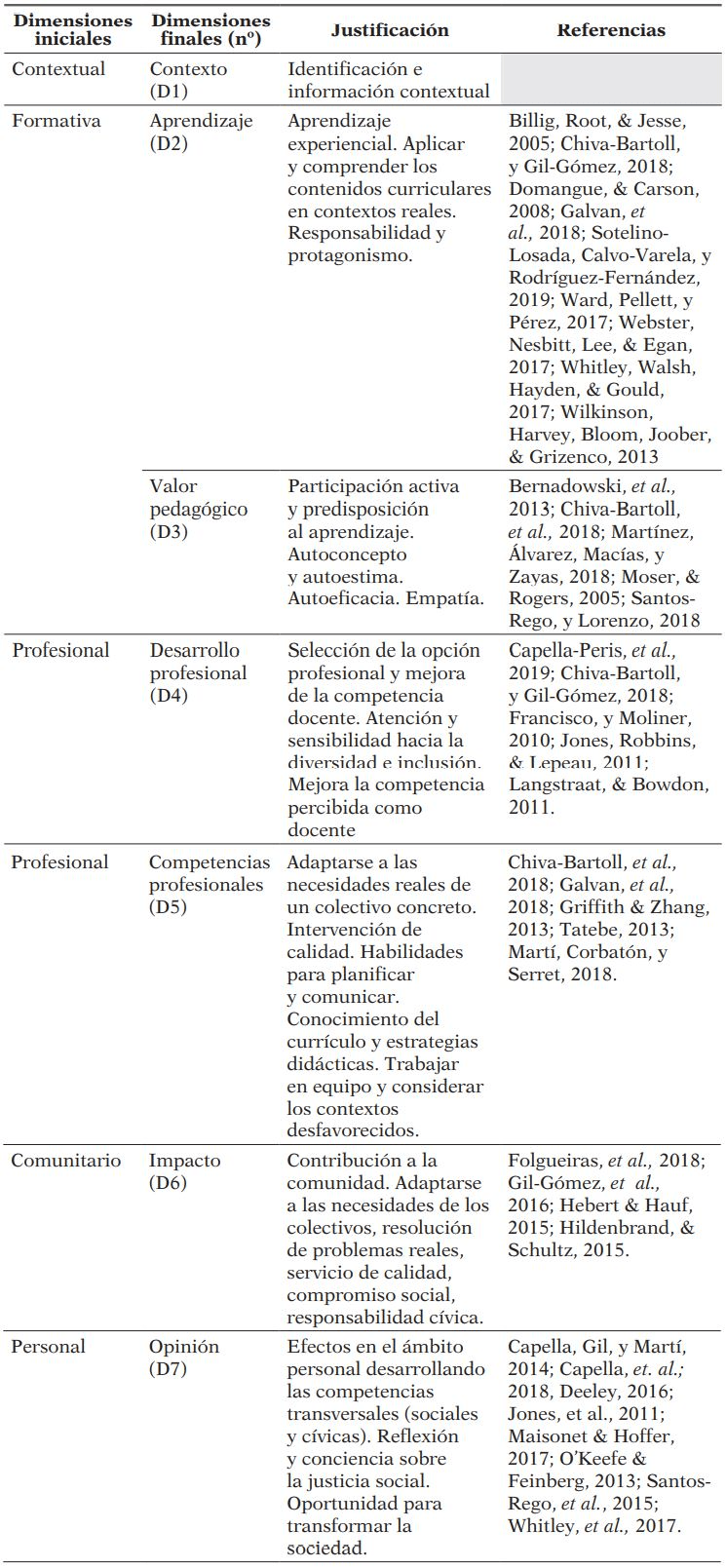 En consonancia con lo expuesto en el marco teórico, en la Tabla 2 se relacionan y justifican las dimensiones propuestas en la versión inicial de la escala “Aprendizaje-Servicio en Actividad Física” (E-ASAF).