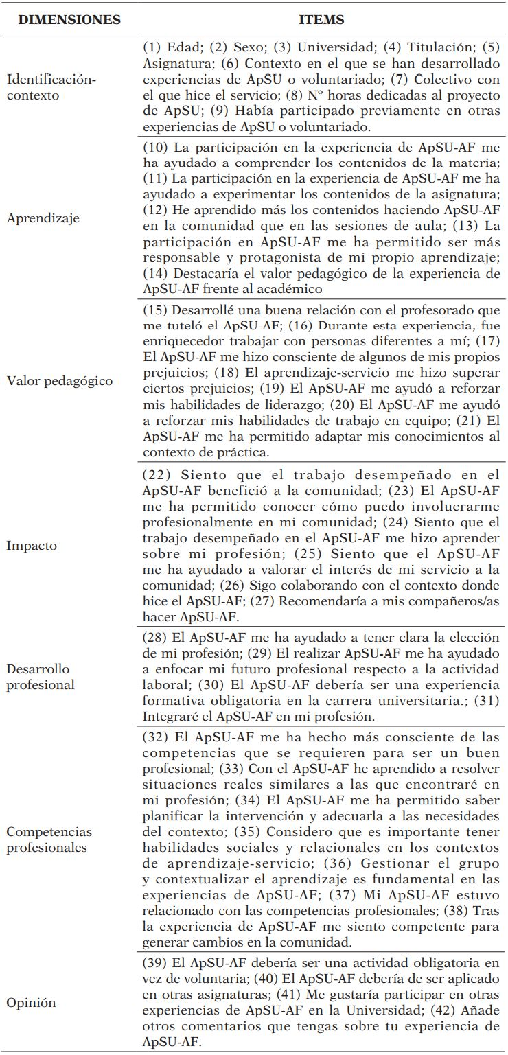 Para la construcción de la escala se toma como principal referencia, por la similitud con el objetivo planteado, el cuestionario The Health Professions Schools in Service to the Nation (HPSSN)-Service-Learning Questionnaire (Shinnamon, et al., 1999), cuyo propósito es conocer el impacto que las intervenciones de ApSU tienen en el alumnado. Particularmente, la HPSSN quiere saber cómo estas experiencias han influido en la perspectiva del alumnado sobre el aprendizaje, su punto de vista del servicio, su elección de especialización y sus perspectivas de trabajar en una comunidad diversa. Esta es una escala formada por 34 preguntas, agrupadas en 5 categorías: (i) información personal y del contexto del participante, formada por 8 ítems; (ii) perspectiva sobre el programa de ApSU en el que se ha implicado, formado por 9 ítems; (iii) actitud sobre su implicación en la comunidad, formado por 7 ítems; (iv) influencia del ApSU en su futuro profesional, formada por 3 ítems; y (v) reflexión personal sobre el ApSU, formada por 6 ítems y uno más de respuesta abierta. Todos los ítems se contestan con una escala Likert de 5 puntos (1- Totalmente en desacuerdo a 5- Totalmente de acuerdo).