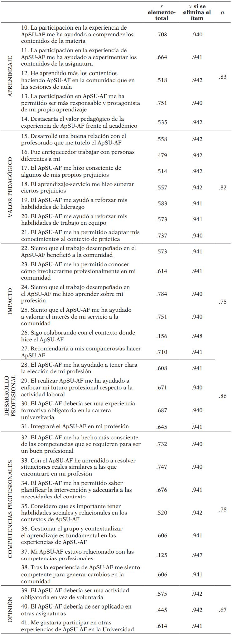 Los resultados han mostrado que E-ASAF presenta unos niveles adecuados de fiabilidad y validez factorial (Shinnamon, Gelmon, & Holland, 1999). La consistencia interna para cada una de las dimensiones de la escala muestra valores muy buenos, superando el criterio de Nunnally (1978) de α = .70 para considerar la fiabilidad adecuada. Los datos muestran un buen ajuste al modelo teórico, lo que nos indica que tiene una estructura válida, formada por 7 dimensiones que integran los factores que se contemplan como relevantes en la literatura revisada respecto a la incidencia del ApSU en la formación universitaria, buscando su contextualización a los posibles escenarios de AF.