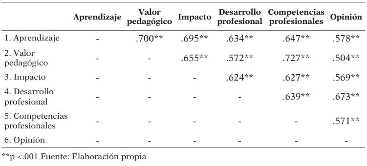 Se analizaron las correlaciones entre las seis dimensiones de la escala para probar la asociación entre las mismas (Tabla 5). Para ello se utilizó el coeficiente de correlación de Pearson. Todas las dimensiones correlacionan alta y positivamente (r ≥ .504) mostrando dimensiones próximas en el continuo. Las dimensiones que muestran mejores valores de correlación son valor pedagógico y competencias profesionales (r = .727; p < .001), y aprendizaje y valor pedagógico (r = .700; p < 001), mientras que las dimensiones de opinión y valor pedagógico, aun presentando buenos valores, son las que muestran las correlaciones más bajas (r = .504; p < .001).