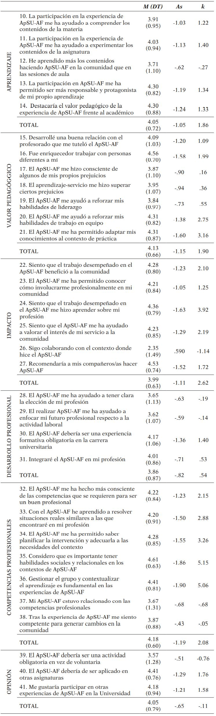 La Tabla 6 presenta los datos descriptivos de la muestra para los ítems estudiados. De forma individual, los ítems que presentan valores más altos son: “Considero que es importante tener habilidades sociales y relacionales en los contextos de ApSU-AF” (M = 4.61; DT = .63) y “Fue enriquecedor trabajar con personas diferentes a mí” (M = 4.56; DT = .66). Los ítems con valores más bajos son “Sigo colaborando con el contexto en el que realicé el ApSU-AF” (M = 2.35; DT = 1.49) y “El ApSU-AF debería ser una actividad obligatoria en vez de voluntaria” (M = 3.57; DT = 1.28). Valorando las dimensiones en su totalidad, la que obtiene una mayor puntuación es “Valor pedagógico” (M = 4.13; DT = 0.66) y la que menos es “Desarrollo profesional” (M = 3.86; DT = .87). Estos resultados pueden estar indicando que el mayor impacto del ApSU-AF deriva de la vinculación con el servicio y los colectivos, más que con la adquisición de aprendizajes curriculares y/o profesionales