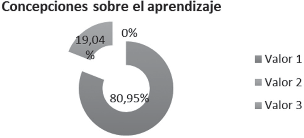 En esta categoría un 80.95% de las unidades de información se sitúan en el valor 1 de la hipótesis de progresión en relación con las concepciones sobre el aprendizaje (CA), un 19.04 % está en el valor 2 y ningún docente se sitúa en el valor 3, es decir, en un modelo de enseñanza centrado en el aprendizaje de los alumnos en el que el docente guía el progreso de las ideas de los estudiantes hacia formulaciones más complejas.