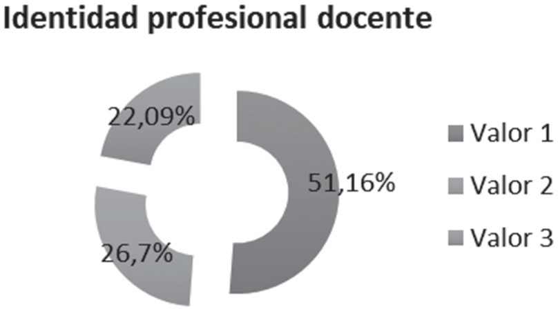 En cuanto a las concepciones sobre la identidad profesional, encontramos 51.16% de valor 1, 26.7% de valor 2 y 22.09% de valor 3 en la hipótesis de progresión.