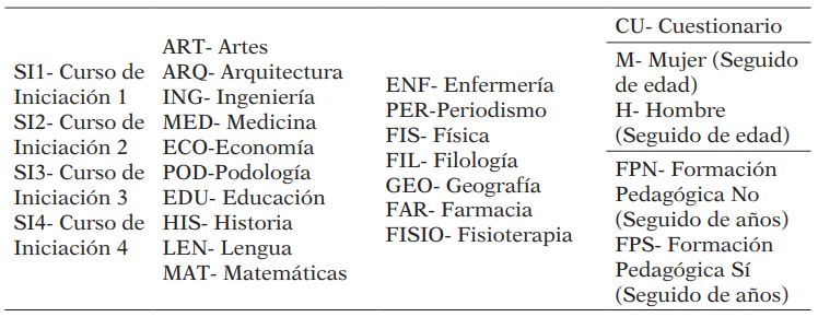 En el presente trabajo vamos a realizar un análisis cuantitativo para obtener los porcentajes de unidades de información correspondientes a la dimensión profesional en la triple vertiente de concepciones sobre la propia disciplina, concepciones del aprendizaje y concepción de la identidad profesional docente. Además, realizaremos un análisis cualitativo de las respuestas al cuestionario dadas por los participantes a través del análisis del discurso (Van Dijk, 2016), y basándonos en una serie de unidades de información a modo de fragmentos discursivos paradigmáticos, que de alguna manera ejemplifican los distintos valores en la hipótesis de progresión del sistema de categorías. Estas unidades de información paradigmáticas o fragmentos de discurso representativos son identificadas mediante una codificación con los siguientes elementos (Tabla 1).