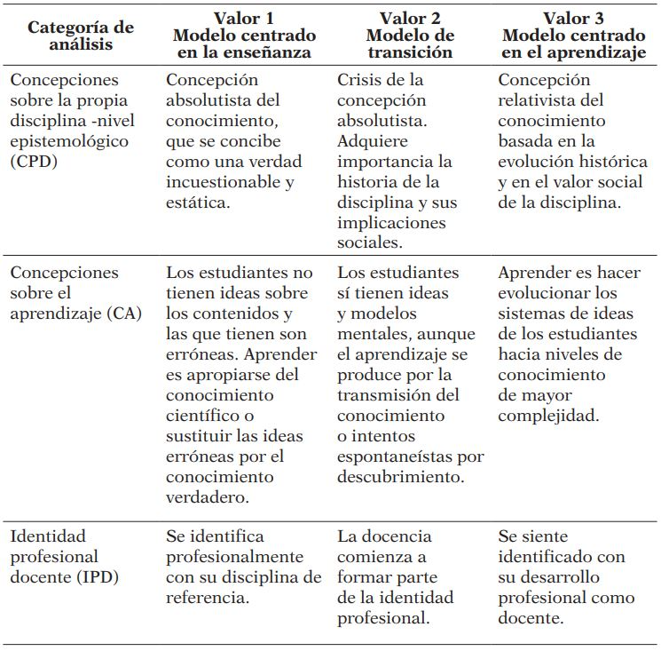 Centrándonos en las dimensiones de análisis que son objeto de la presente investigación, concepción de la propia disciplina, concepción del aprendizaje e identidad profesional, han de tenerse en cuenta las particularidades del profesorado universitario, que no encontramos en otros niveles educativos, pues “se trata de un profesorado en cuya formación se ha priorizado la especialización en un ámbito disciplinar, lo que hace que esté más orientado a la disciplina que a la propia profesión docente” (Zabalza et al., 2014, p. 41). Además, afirma Postareff (2007) que lo que caracteriza al profesorado universitario es el dominio de su propia disciplina, incluida su experiencia en torno a este dominio en relación con las concepciones que los docentes tienen sobre su modelo didáctico. Este modelo didáctico estaría formado por “pautas, rutinas y esquemas de acción que no responden a decisiones fundamentadas sino a hábitos asumidos de manera poco consciente” (De Alba y Porlán, 2017, p. 37) y que lleva a la repetición de comportamientos basados en la imitación de modelos o referentes sin la debida reflexión sobre sus fundamentos y sus implicaciones para una mejora de la enseñanza y el aprendizaje de los estudiantes.