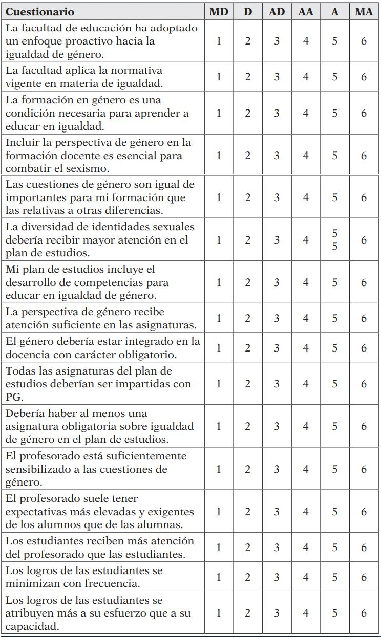 La existencia de múltiples formas de resistencia a la incorporación de la PG a la educación universitaria y, sobre todo, el desconocimiento de en qué medida esta se implementa en la docencia deja claramente en entredicho la capacidad del sistema universitario para formar a docentes capaces de educar en igualdad a las generaciones futuras. El presente estudio surgió con el propósito de explorar mediante encuesta el grado de implementación del enfoque de género en el ámbito de la formación del profesorado. Dada la ausencia de instrumentos aptos para la medición del constructo, se optó por diseñar uno ad hoc. Los objetivos que nos planteamos fueron: