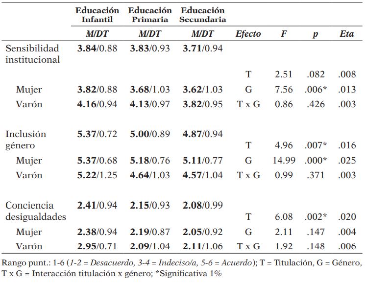 La comparación de medias por titulación (Tabla 3) reveló que el alumnado de educación infantil percibía la inclusión del género en su formación más necesaria (M = 5.37) que el de primaria y secundaria (M = 5.00 y 4.87, respectivamente) (p = .007); específicamente otorgaba una mayor importancia al carácter obligatorio (p = .043) y transversal (p = .001) que debía tener la incorporación de la PG en el currículum que el alumnado de primaria y secundaria. Los datos también revelaron que la conciencia de desigualdades de género era significativamente más baja en el alumnado de primaria (M = 2.15) y secundaria (M = 2.08) que en el de infantil (M = 2.41) (p = .002).