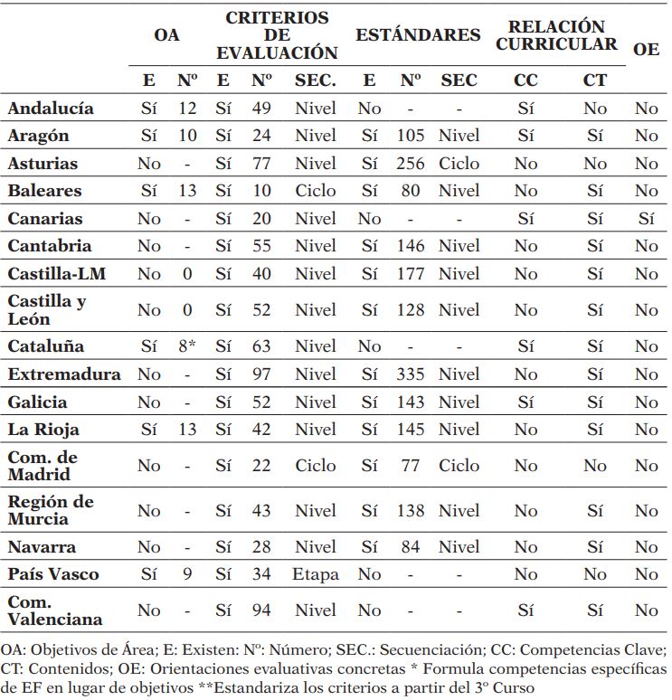 Un primer análisis exploratorio muestra (Tabla 2) la eliminación de los objetivos de área en los currículos autonómicos (solo 6 CCAA los mantienen). La mayoría de las Comunidades secuencia los criterios de evaluación por nivel (excepto País Vasco, Madrid y Baleares). Solo 11 Comunidades utilizan estándares (el resto criterios de evaluación) de las cuáles 9 los secuencian por nivel y dos por ciclo promediando 127.09 estándares por comunidad. En cuanto a la relación con otros elementos del currículo, solo 5 Comunidades relacionan sus referentes evaluativos con las 7 competencias clave (Andalucía, Aragón, Canarias, Galicia y Valencia) y la mayoría los relaciona con los contenidos excepto 4 de ellas (Andalucía, Asturias, Madrid y País Vasco).