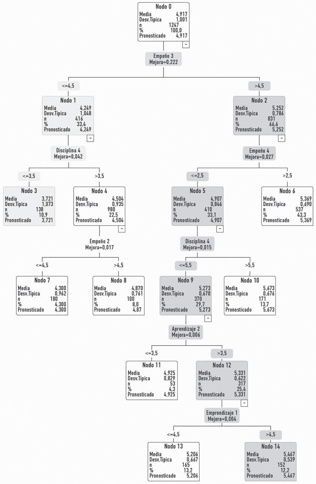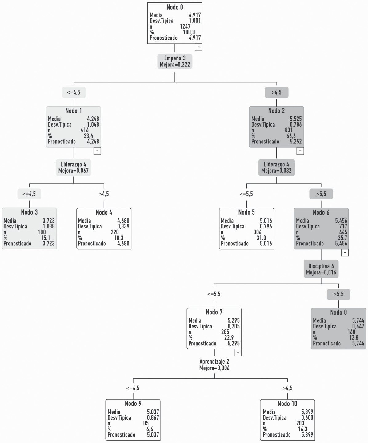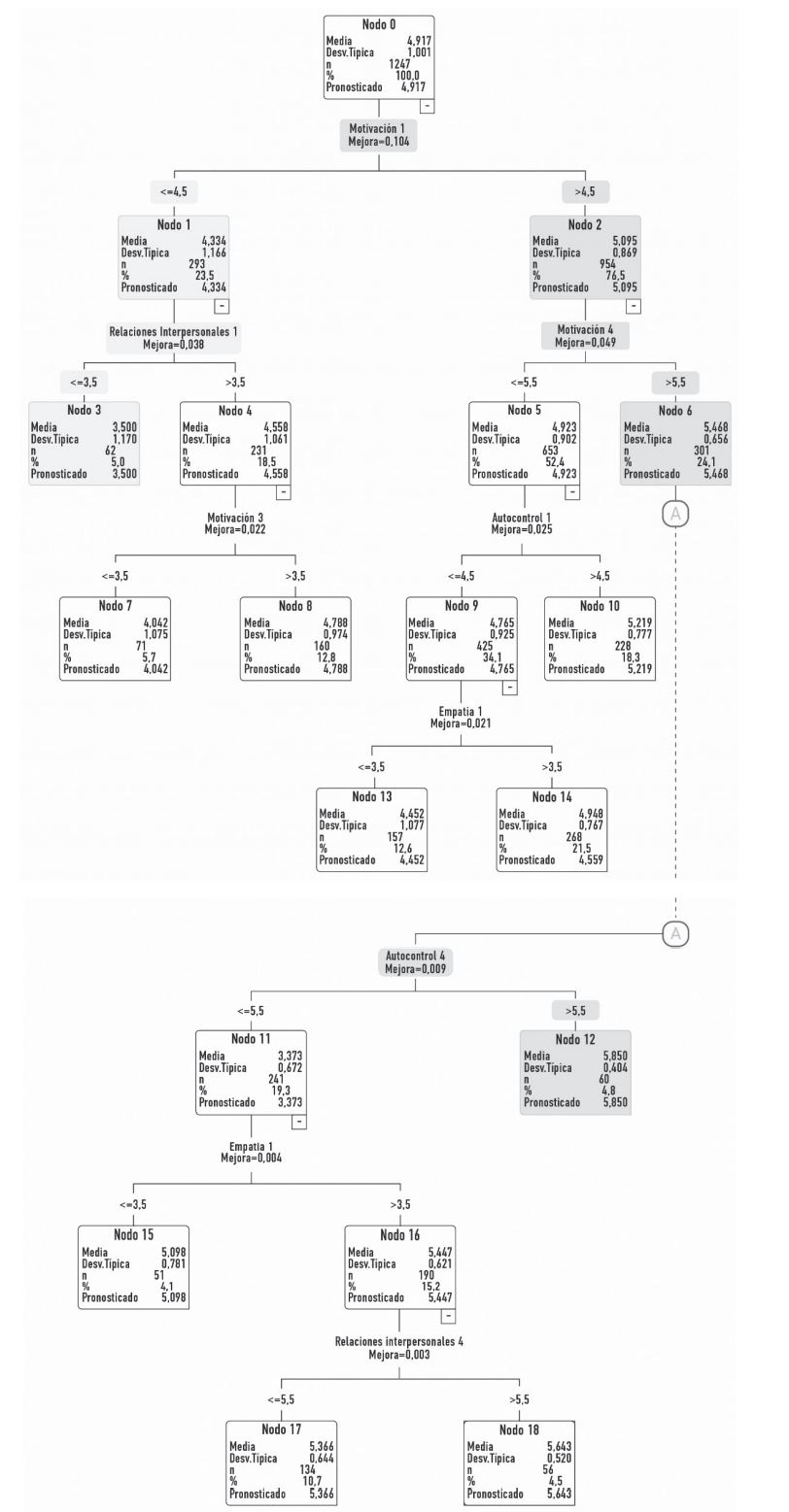 Con el propósito de ubicar, de las 60 que componen el cuestionario, las principales variables en cuanto a su capacidad de explicación del ítem elegido como criterio, se ha obtenido, del análisis de segmentación mediante el algoritmo CART, que los nodos más extremos son el 3 y el 8. El nodo 3 se corresponde con un grupo con N = 188 sujetos que se puntúan como medianamente competentes para el trabajo, con una media de 3.72 y se caracteriza por el hecho de que son sujetos que se puntúan como menos de4.5 en el ítem 59 y en el ítem 28, que emergen como las variables de más importancia a la hora de explicar la variable dependiente o variable criterio. De esta manera, los participantes que se perciben como menos competentes globalmente son los que se consideran menos persistentes hacia el logro de las tareas y los que confiesan que se comprometen menos con realizar bien el trabajo, siendo la puntuación de corte en ambos casos 4,5.