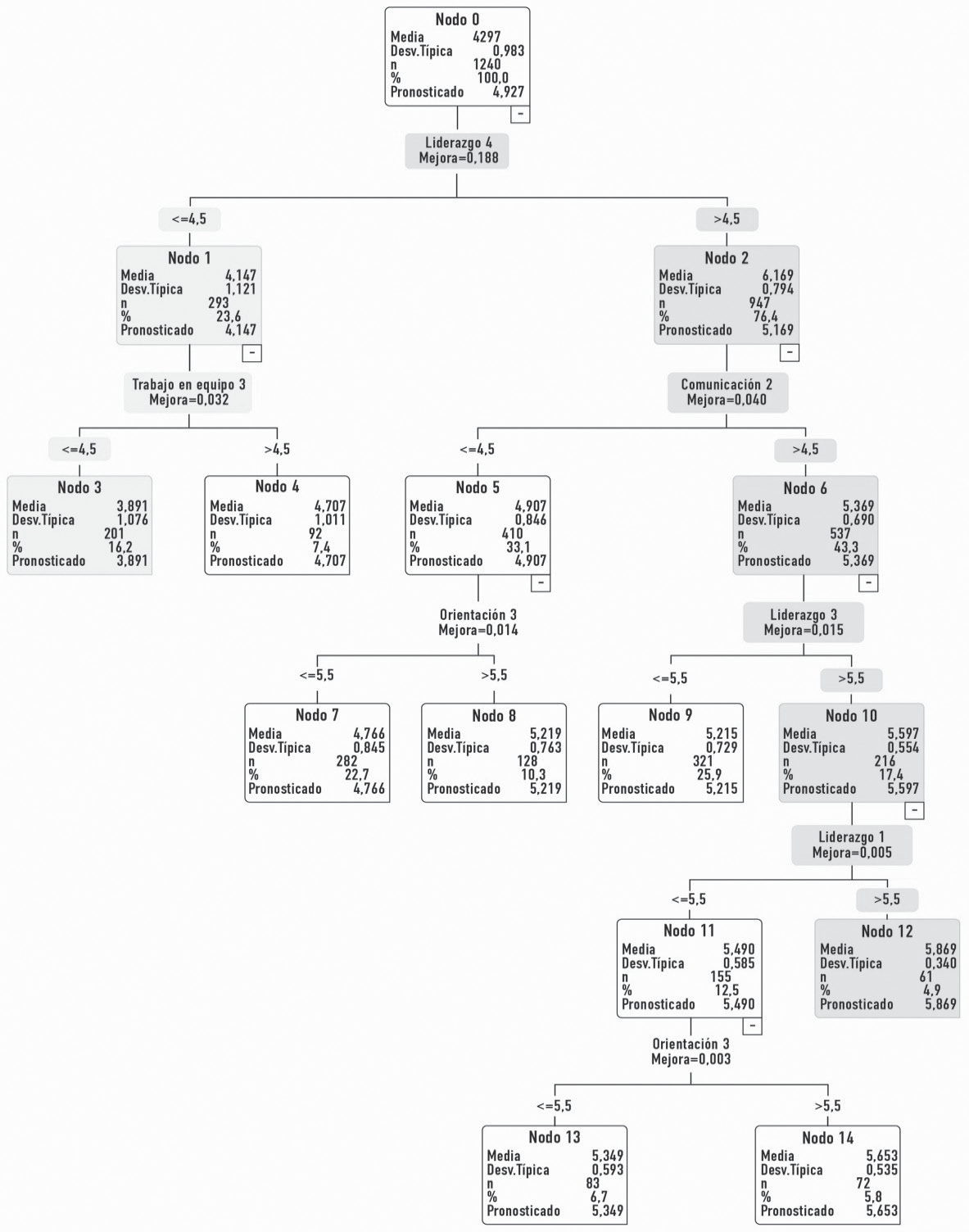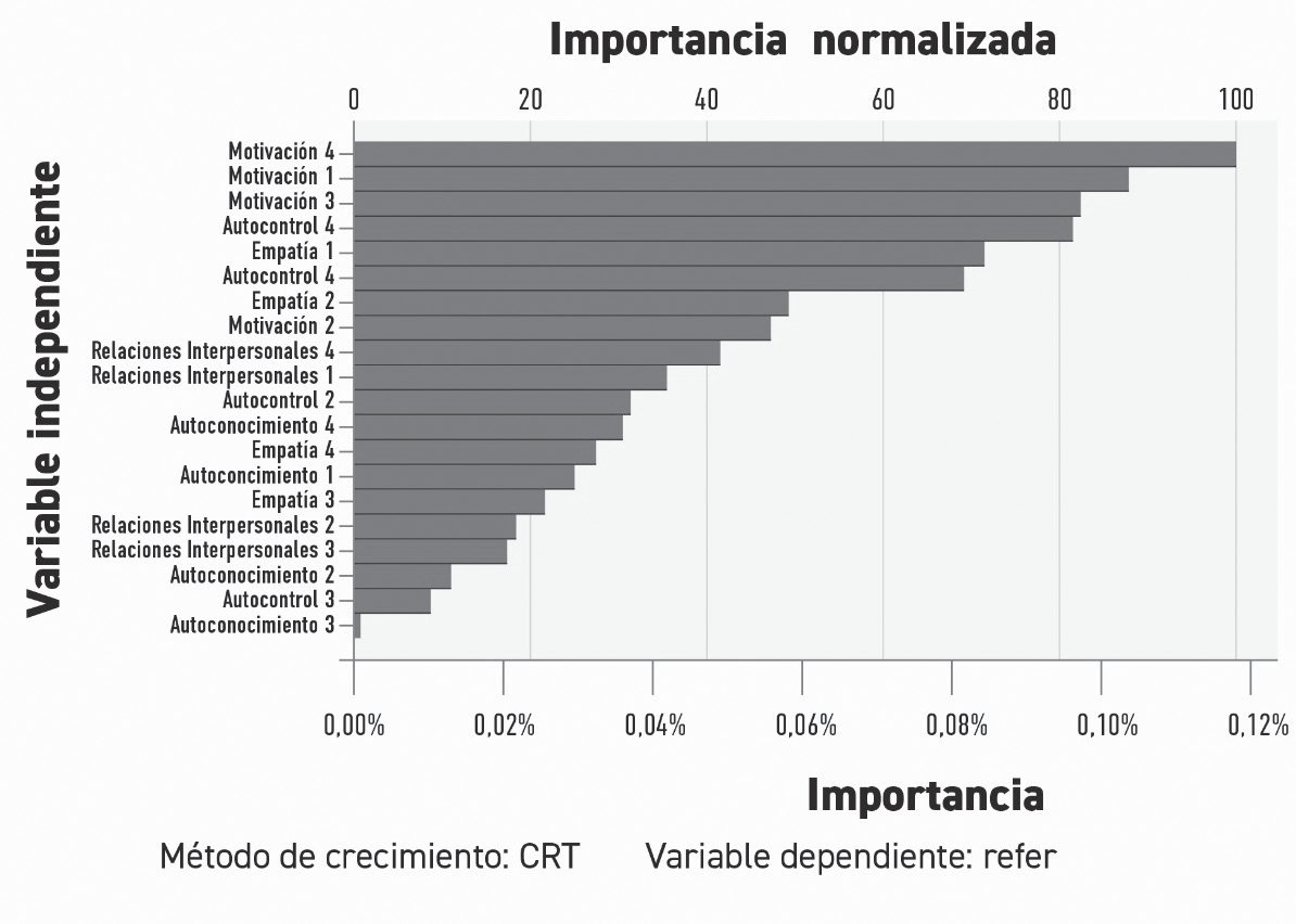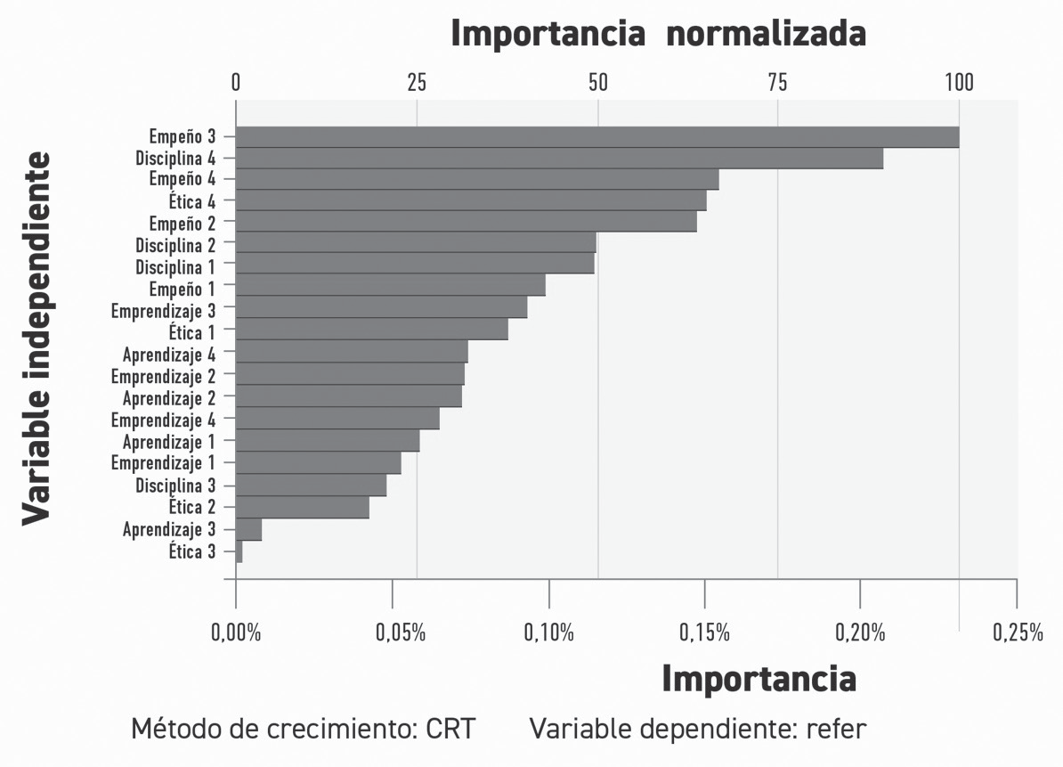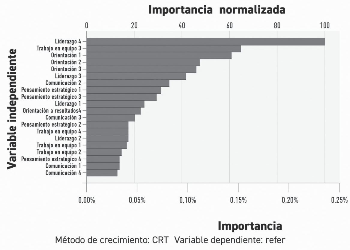Según la información sobre importancia normalizada aportada por CART, la variable más importante a la hora de pronosticar la variable criterio es el compromiso, seguida por la participación activa en los trabajos de equipo y el acierto en la toma de decisiones en momentos de crisis. Las menos importantes resultaron ser las variables 40, 37, la 24, habilidad para convertir las habilidades en fortalezas, y el trabajo en equipo que impulsa innovaciones (variable 30) y el trabajo en equipo que busca la integración (variable 29).