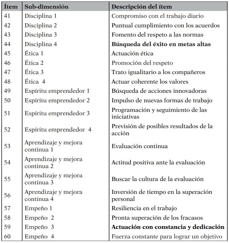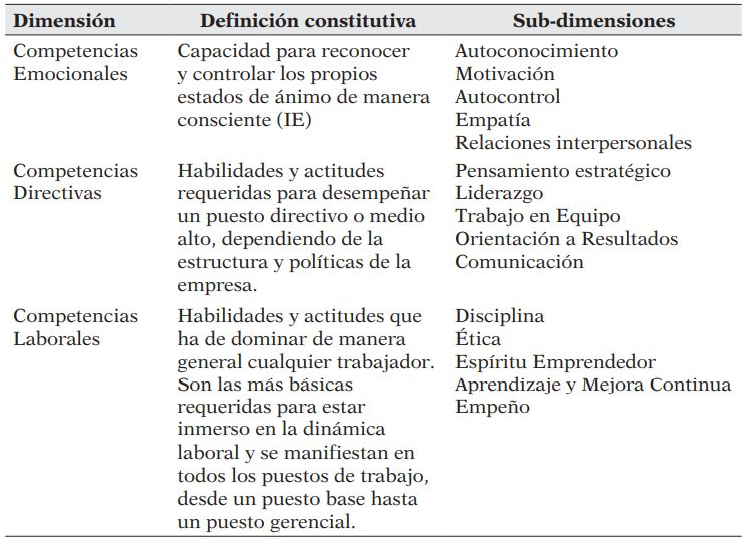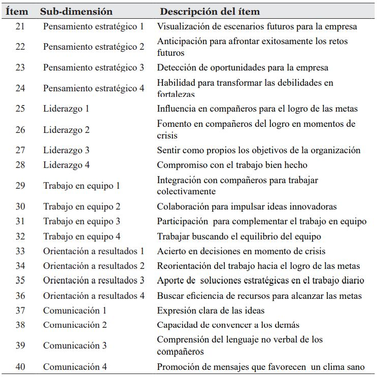 El resto de competencias laborales, que constituyen la tercera dimensión (a = 0,876), se describen en la tabla 4.