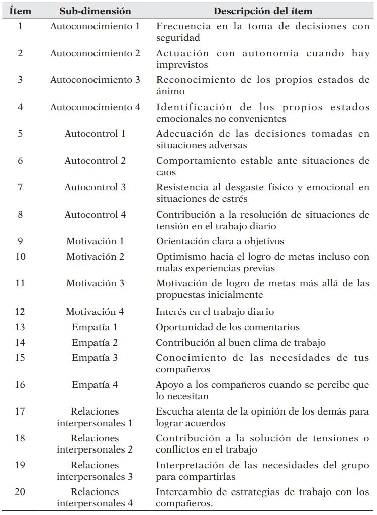 Las competencias emocionales, que constituyen la primera dimensión con un α=0,881, se describen en la tabla 2.