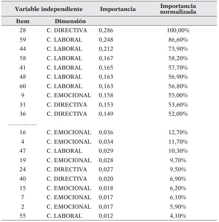 En la tabla 5 se ofrecen ordenadas 20 de las 60 variables que componen el COMPETEST según su importancia en la explicación de la competencia para el trabajo globalmente autopercibida, tomada como variable criterio o referencia y medida con la incorporación en el cuestionario del ítem 61. Entre las 10 variables más relacionadas con la variable criterio se encuentran 6 laborales (tres ítems de empeño, dos de disciplina y uno de ética), 3 directivas (uno de orientación a la meta, uno de liderazgo, uno trabajo en equipo y uno comunicación interpersonal) y 1 emocional (un ítem de motivación).