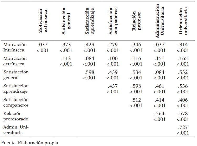 Por otra parte, la motivación intrínseca se asoció con mayor intensidad (aunque de forma moderada) con aquellos indicadores de satisfacción relacionados con la experiencia de aprendizaje y la relación con el profesorado, mientras que la motivación extrínseca correlacionó con mayor potencia con el indicador que podría considerarse como más instrumental para la obtención del título y la futura inserción laboral: la satisfacción con la orientación universitaria recibida. La satisfacción general con la experiencia universitaria también correlacionó con mayor intensidad con la motivación intrínseca que con la extrínseca.
