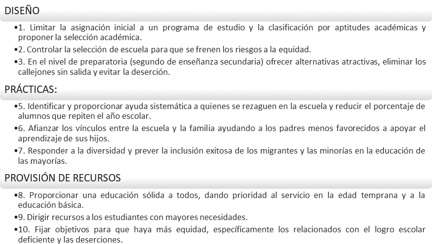 El grueso del informe se centra en las estrategias para trabajar la equidad desde la política educativa, diseñando para ello un decálogo de diez pasos estratégicos (figura 1): desde el diseño (estructuras conductivas y trayectorias dentro de los sistemas educativos), las prácticas educativas inclusivas dentro y fuera de la escuela y los recursos y los objetivos prioritarios en los que ha de centrarse. De la primera, el diseño, se critica la selección académica temprana y las escuelas comprehensivas. Apuesta con ello por el diseño de una educación inclusiva, a través de un “currículum más flexible y diverso» (OECD, 2008, p.4), con acciones como completar la educación básica y mejorar las transiciones, optar por alternativas equivalentes (formación profesional), servicios de guía y de orientación educativa profesional, líneas ágiles con el mundo laboral y promover escuelas de segunda oportunidad, incluida la educación de personas adultas, además de reconocer el aprendizaje previo adquirido. Respecto a las prácticas, apuesta por el compromiso efectivo con metodologías flexibles en la clase y su coherencia con el consiguiente compromiso también con los hogares: con el fomento de la lectura, por ejemplo, el apoyo a los deberes, el fortalecimiento de cauces de comunicación y la creación de auténticas comunidades de aprendizaje. Finalmente, respecto a recursos, recomienda establecer prioridades por sectores, desde educación infantil a superior, distribuyéndolos por países y regiones, bajo la recomendación tácita de descentralizar, educativamente hablando, a través de la cesión a las escuelas de recursos para programas concretos.