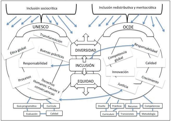 Para concluir, el papel de los organismos internacionales como OCDE y UNESCO consiste fundamentalmente en ofrecer un discurso global que los gobiernos deberán transferir y aplicar posteriormente en función también de los contextos que juegan un papel prioritario. Ambas agencias, por su parte, desde sus respectivos discursos intertextuales, identifican los problemas, los transfiguran en indicadores y organizan su capacidad de resolución ofreciendo recetas político-sociales, en este caso, de naturaleza inclusiva.