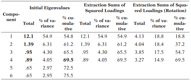 The matrix obtained in the correlation analysis (with sample adjustment coefficients for each variable) shows low correlation coefficients, which again confirms that the PCA is adequate for the study variables. In addition, the 4 factors explain 69.54% of the variance (above the 60% proposed by Hair and colleagues (2014) with the first factor explaining 54% and the rest more than 4% each). The eigenvalues of these 4 components are also greater than .8, which complies with the most commonly used criterion: when the percentage of total variance explained for each component reaches a cumulative percentage that is considered high, usually about eighty percent, the number of factors is sufficient.