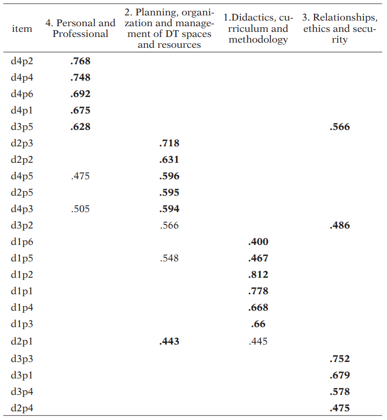 To make interpretation easier, and as we have mentioned above, we used Varimax rotation which converged in 8 iterations. This indicates that the extraction was carried out by four components. As we have seen above, we managed to obtain more than 69% of the explained variance with this number of components. For a better understanding, table 3 shows the rotated components that are already ordered by the factors (or dimensions) of our instrument. We erased all the weights of the items that were not greater than 0.45, again following the criterion quoted by Hair and colleagues (2014), which specifies that for a sample between 120 and 150 people, this is the minimum factor weight of the items included in a factor. To measure internal reliability, we used Cronbach’s Alpha coefficient. Dimension 1 (6 items), Personal and professional, is highly reliable (α = .885). Dimension 2 (5 items), Planning, Organization, and Management of DT spaces and resources, is also reliable (α = .889). Dimension 3 (5 items), Teaching Curriculum and methodology, can be considered to be very good (α = .844), and Dimension 4 (6 items), Relationships, ethics and security, is the most reliable of all (α = .906). If we remove an item from any of the dimensions, the value of this indicator decreases, so we used this composition for our instrument. The total number of items is 22 and the total Cronbach Alpha of the instrument is α = .896.
