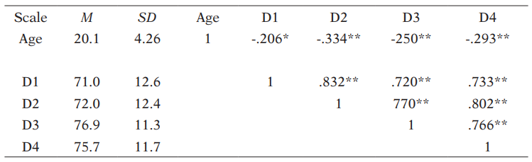 The students in the sample scored highest on D3. Relational aspects, ethics and security, followed by D4. Personal and professional, and lowest on the two pedagogical dimensions: D2. Planning, and D1. Didactics, curriculum and methodology. There are, however, no significant differences between the scales, and they all correlate positively and significantly with each other (see table 4). To analyze the relationship between age and each of the four TDC dimensions in the students in our sample, we calculated the Pearson coefficient. The results show that the students’ age correlates significantly with dimensions D2. Planning, organization and management of digital technological resources and spaces, r (142) = -.29, p < .01; D4. Personal and professional r (142) = -.33, p < .01, and D3. Relational, ethics and security r (142) = -.25, p < .01. However, with D1. Didactics, curriculum and methodology, it only correlates at the level p < .05, r (142)= -.21 (see Table 4). All the correlations indicate a negative relationship; that is, that the younger students are, the higher they self-evaluate their competence in TDC.