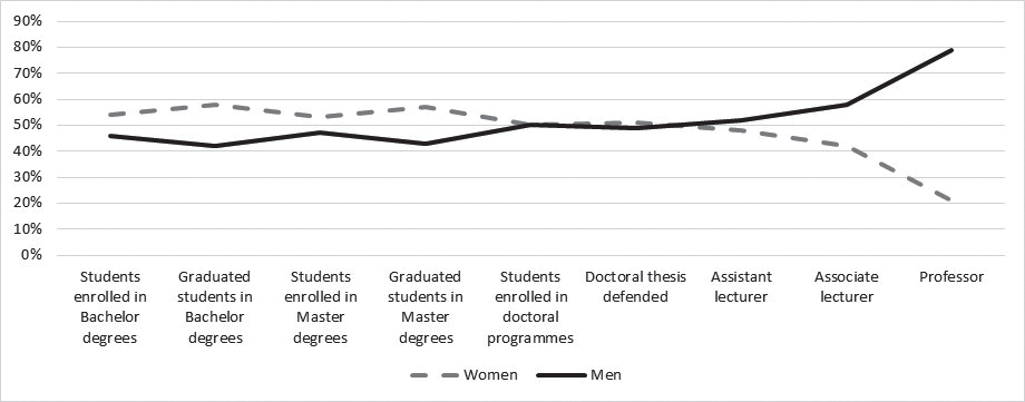 In Spain, the slow growth in the number of women in professional academic and research positions does not correspond to the speed at which women graduate and achieve doctorates (FECYT, 2005). The number of women studying for Bachelor’s and Master’s degrees at universities and on PhD programmes is much higher than that of men. 52% of doctoral theses were by women in 2017 (Educabase). As shown in Figure 1, after completing their PhDs, academic women seem to not go forward. This pattern can be seen in other countries as shown by ETAN (2001) and the She Figures (EC, 2015, 2018b). Consequently, feminization in universities refers essentially to students at predoctoral level (Consell Interuniversitari de Catalunya, 2015).