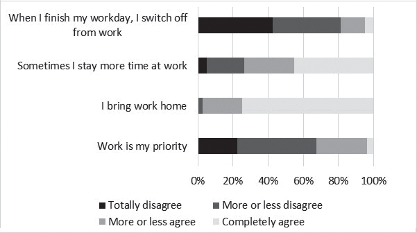 Regarding co-workers’ approach to their pregnancy and maternity, the majority of mothers answered that these were well accepted (69 and 70% respectively). When returning to work after maternity leave, 85% were able to continue with their tasks and 15% changed; 5% of whom said that this change was beneficial. On the other hand, 54% said they started to work remotely more frequently. 43% reduced their working hours while 50% continued working the same hours as before. Data show that academics in general have long working hours, and 38% said they work more than 8 hours per day. Figure 2 shows that, even though work is not a priority for them, most of the respondents agree with the statement “I bring work home” (75%) or “I stay more time at work”