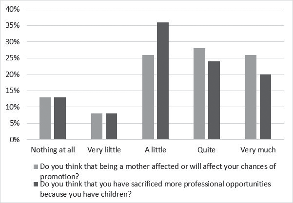 More than half of the respondents considered that motherhood had influenced or will influence their chances of promotion. However, less than half considered that they had sacrificed professional opportunities because of their motherhood and were confident they would obtain promotion without having to move to a different workplace. Mason and Goulden (2002) and Williams (2004) indicate that women who become mothers soon after completing their doctorates are less likely to gain tenure than their male counterparts who become fathers at the same point in their educational pursuits, across disciplines and types of institution. Women who have babies early in their career are more likely than others to form part of the ‘bottleneck’ problem, i.e. the non-tenured academic second tier (lecturers, etc.). On the other hand, women who have babies later on show a trend that is similar to women who have no children (Mason & Goulden, 2002). Sánchez de Madariaga et al. (2011) show that, with similar backgrounds, a man with children is four times more likely to be promoted to a professor position than a woman with children.